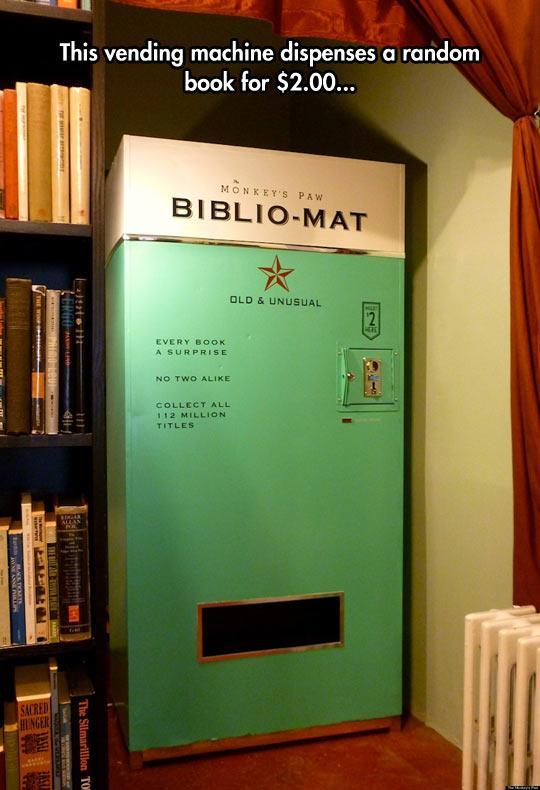 Biblio-Mat books, which vary widely in size and subject matter, cost two dollars. The machine was conceived as an artful alternative to the ubiquitous and often ignored discount sidewalk bin. When a customer puts coins into it, the Biblio-Mat dramatically whirrs and vibrates as the machine is set in motion. The ring of an old telephone bell enhances the thrill when the customer’s mystery book is delivered with a satisfying clunk into the receptacle below.