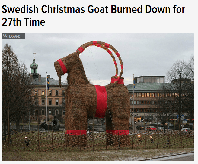 2005Burnt by unknown vandals reportedly dressed as Santa and the gingerbread man, by shooting a flaming arrow at the goat at 21:00 on 3 December. Reconstructed on 5 December. The hunt for the arsonist responsible for the goat-burning in 2005 was featured on the weekly Swedish live broadcast TV3’s “Most Wanted“ (”Efterlyst”) on 8 December.