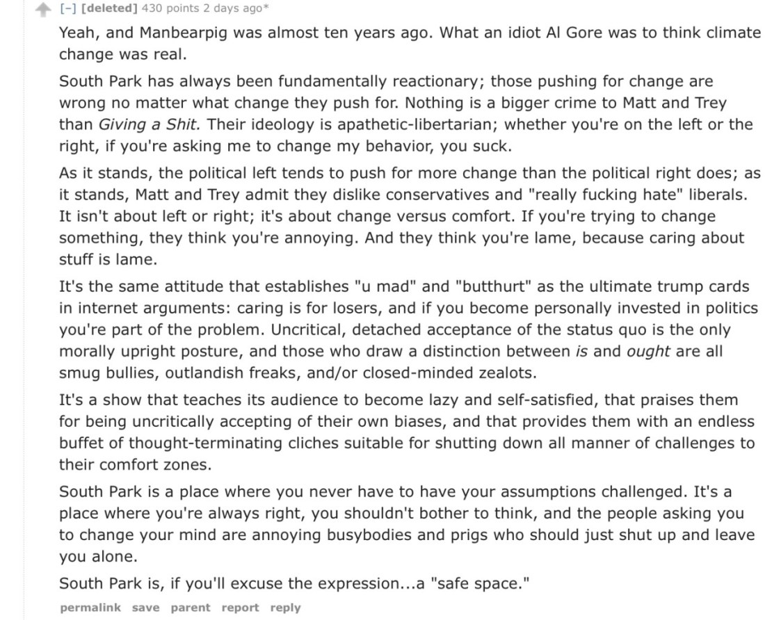 imdavidflood Uncategorized November 25, 2015December 10, 2018 1 Minute brainstatic: This is the best description of South Park (and their brand of apathetic conservatism) I ever read. Share this: Share on X (Opens in new window) X Share on Facebook (Opens in new window) Facebook Like Loading... Related Published by imdavidflood View all posts by imdavidflood Published November 25, 2015December 10, 2018